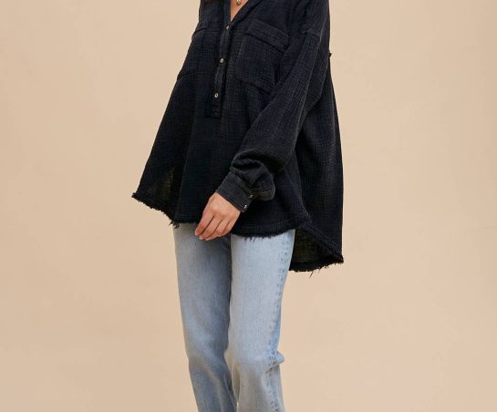 LONG SLEEVE MINERAL WASHED COTTON GAUZE BLOUSE FEATURES BREAST POCKETS, FRONT FUNCTIONAL BUTTONS, SPLIT SIDE HEM, AND RAW SEAMS.