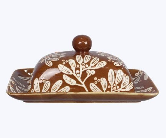 Enhance your dining table with this elegant stoneware butter dish featuring a beautiful leaf design. Crafted from durable stoneware, it keeps your butter fresh while adding a touch of nature-inspired charm to your kitchen. The lid fits securely to preserve freshness, and the intricate leaf pattern makes it a stylish and functional piece for any meal setting.